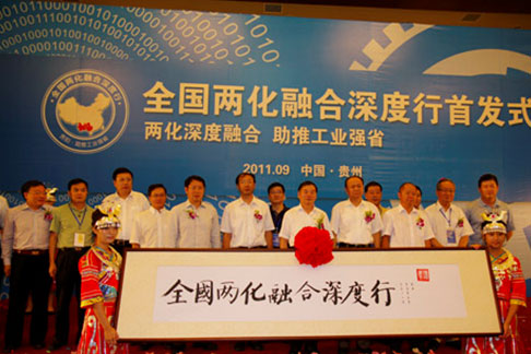| 工信部副部长杨学山、贵州省副省长孙国强出席了“全国两化融合深度行”贵阳首发式 | 9月6日,由工业和信息化部信息化推进司和贵州省经济和信息化委员会共同主办,工业和信息化部电子情报研究所承办,用友软件和计世资讯等共同协办的“全国两化融合深度行首发式”在贵阳隆重开启。 工业和信息化部杨学山副部长,贵州省孙国强副省长,工信部信息化推进司徐愈司长,贵州省经信委主任王江平, 用友公司董事长兼CEO王文京发表了重要讲话,瓮福集团董事长何浩明、茅台集团总经理袁仁国、航天电器总经理原维亮、长通电力总经理张钊、赤天化总经理田勇、翁福集团CIO蒋华、贵州电信副总经理郑成渝等与来自全国信息化主管部门和企业界300余名代表分享了其企业两化融合的典型经验。