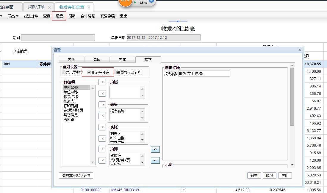 用友T+收发存汇总表设置千分符
