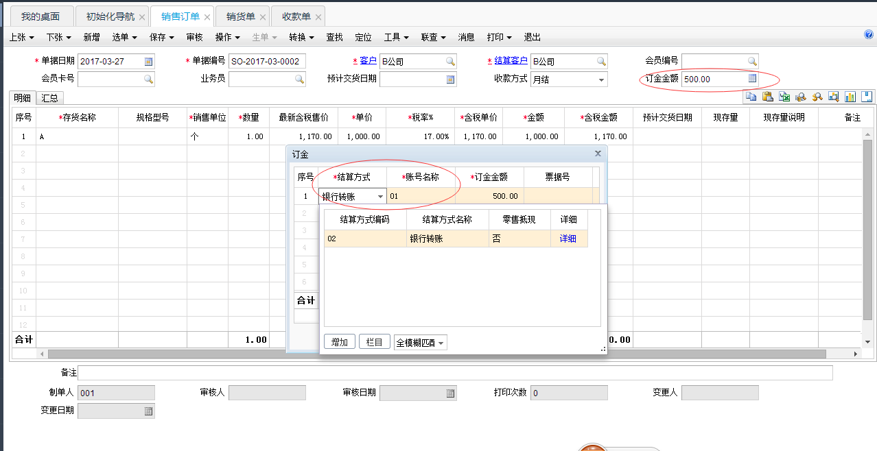 1,打开销售管理模块,做“销售订单”,录入好客户及结算客户和客户给的预收款订金金额,点订金金额方框内的计算机,选择结算方式。录好存货明细后点保存审核。