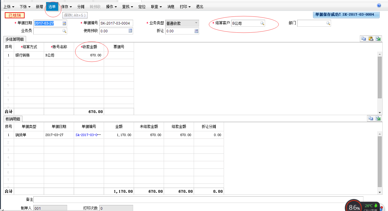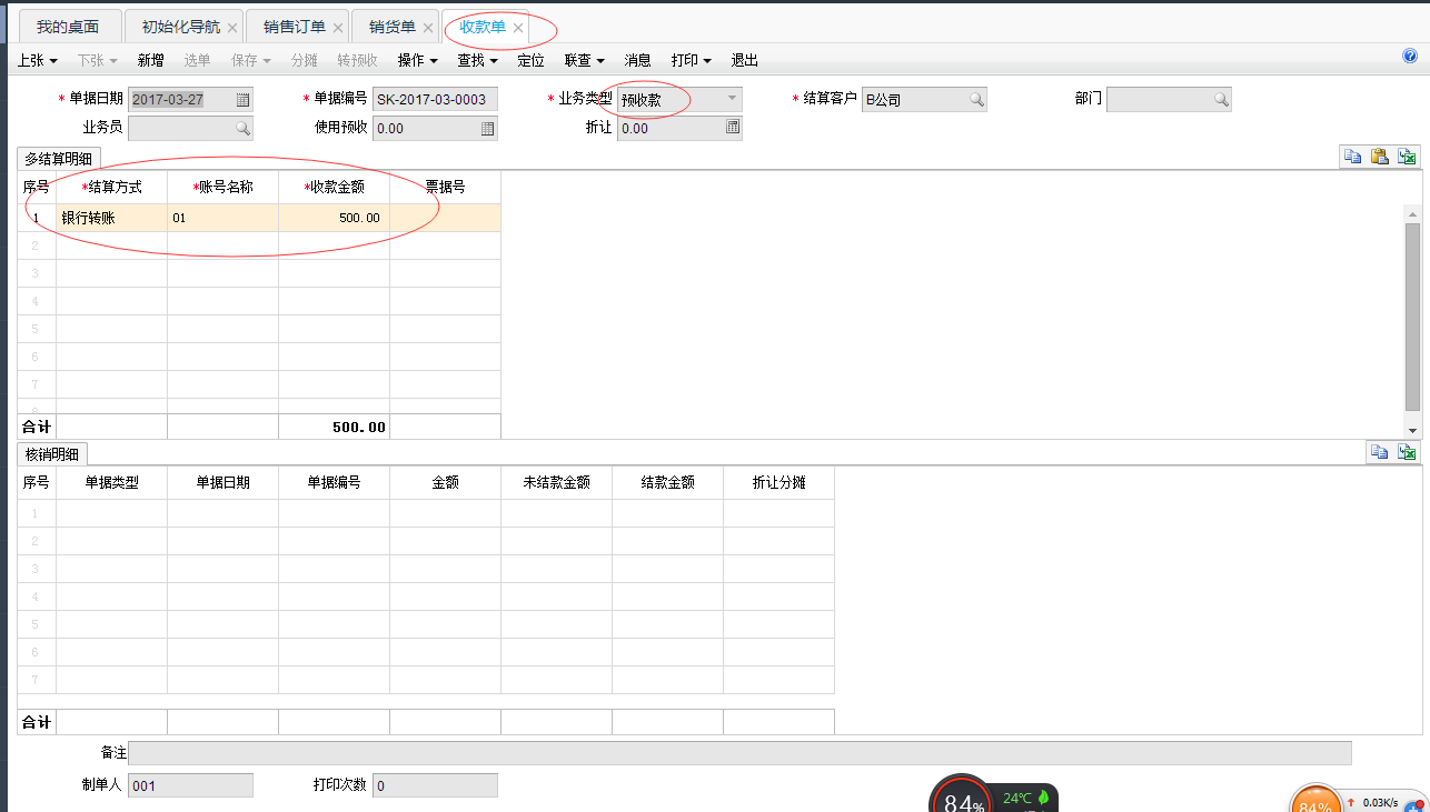 4,结算,往来业务模块,做“收款单”,选择结算客户,选单,选择“销货单”,填写多结算明细的结算方式及金额。点保存就会显示已核销。再来查看销货单,就会显示已结清。