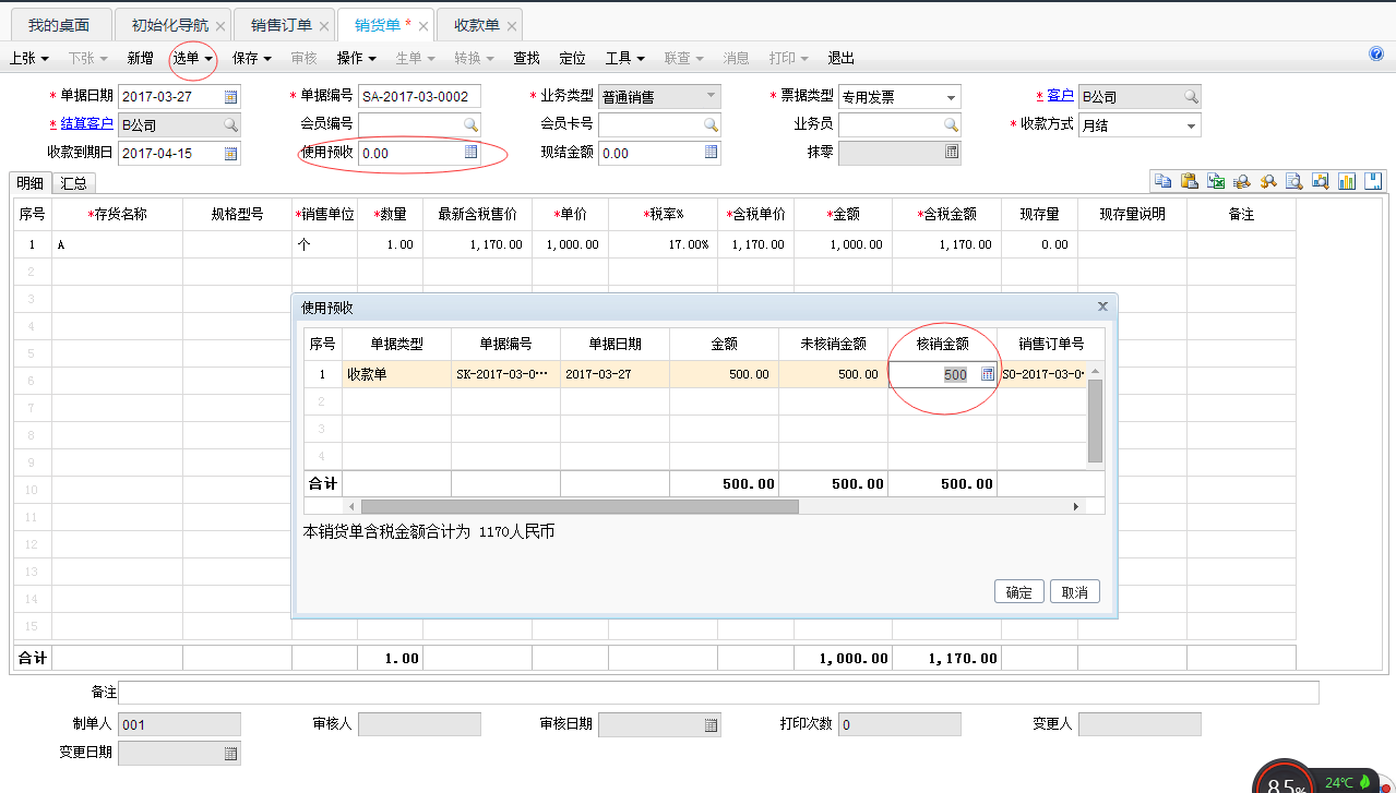 3,做“销货单”,选单,选择销售订单,点使用预收,填写核销售金额,点确定。保存,审核。