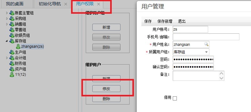 在“系统管理”下的“用户权限”,点到用户组下的维护用户进行修改