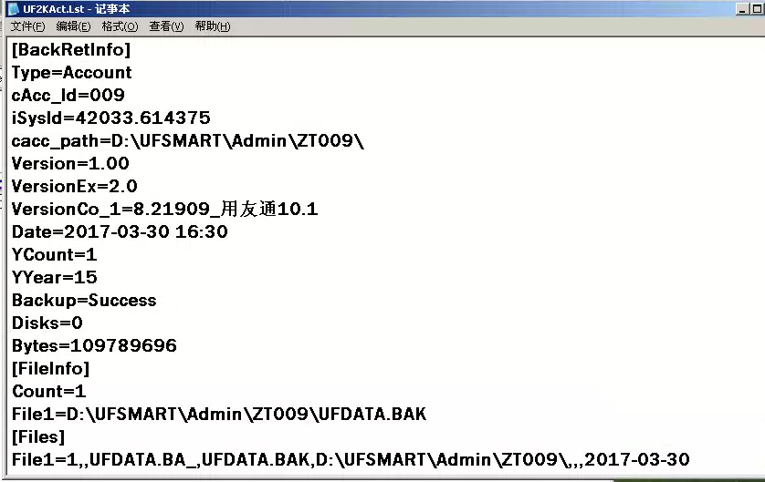 3)将记事本内的账套号001全部修改为末使用的账套号,如009,保存。再在系统管理恢复就可以了。