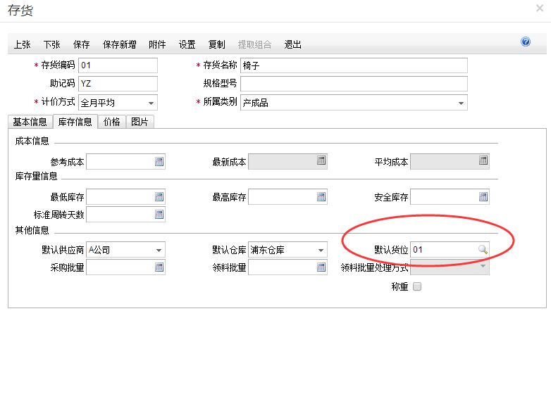 6)存货档案默认货位