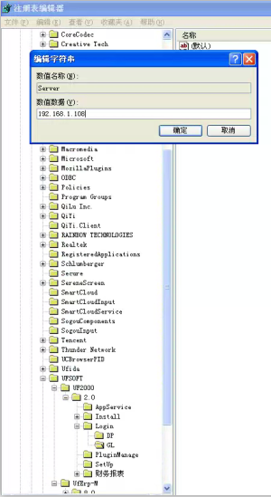 打开hkey_local_machine,software,ufsoft,uf2000,login,gl将server字符串的数值数据改为服务器地址IP或服务器计算机名称,确定。