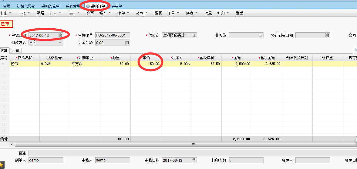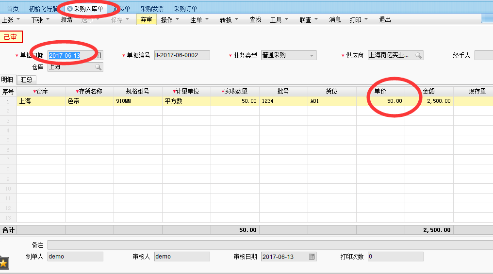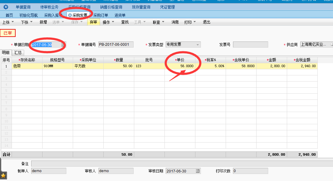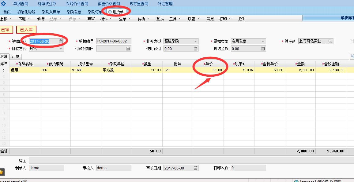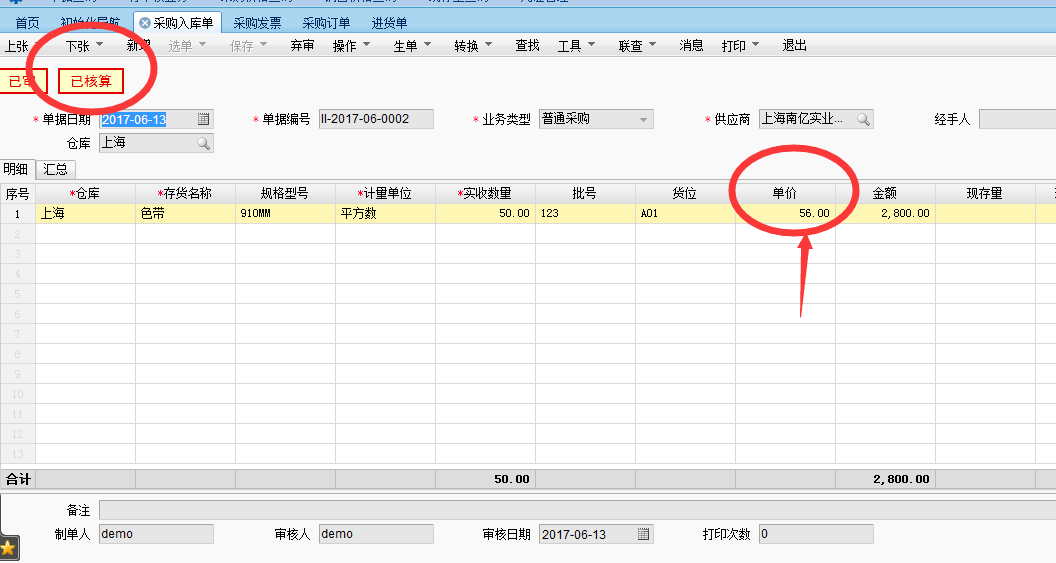(2)6月30日收到发票填完采购发票/进货单审核以后,采购入库单上的单价会按照发票上的真实单价回填成56元,且会有“已核算”的标志。