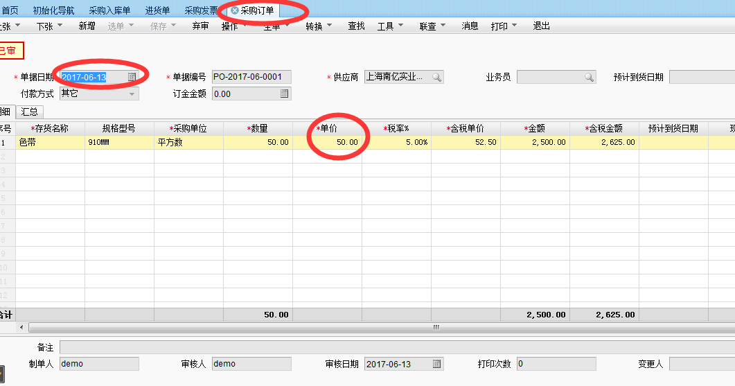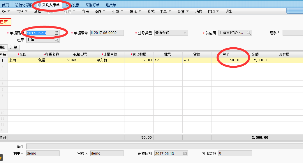6月13日填写采购订单、采购入库单,色带50个,单价50元。并审核。