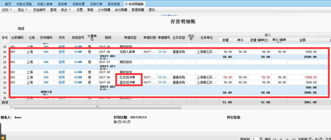 (3)查看存货明细账,发票到后会生成红蓝回冲单的记录,先冲掉暂估的数量和单价再生成一条正确的数量和单价。