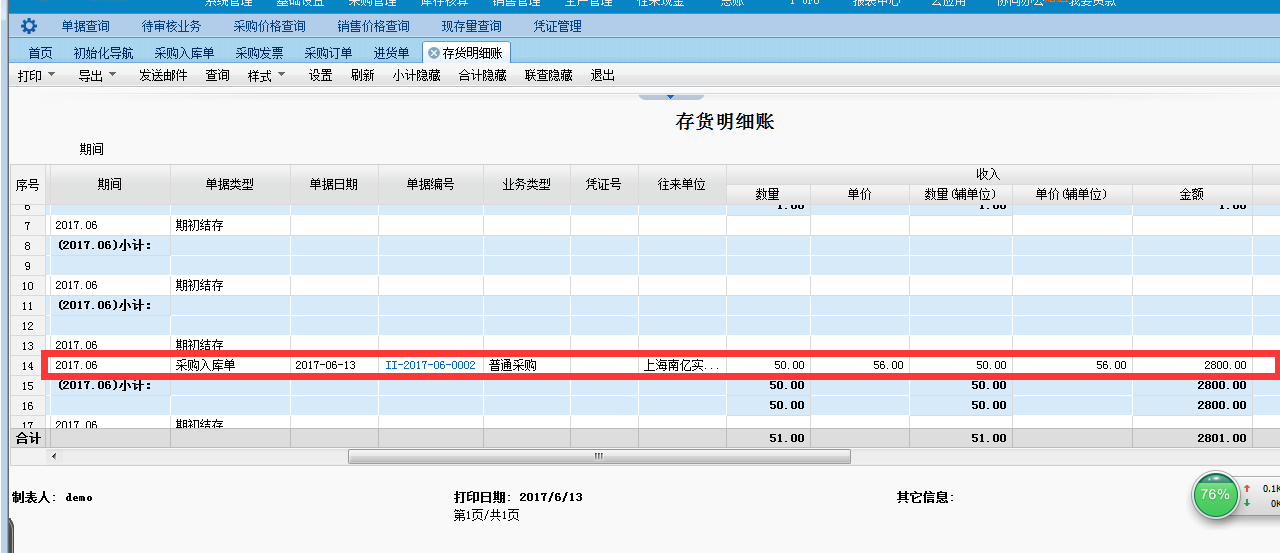 3)查看存货明细账,只有一条采购入库单记录,单价为发票上的真实单价。
