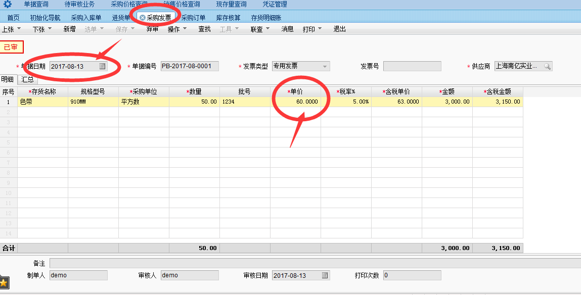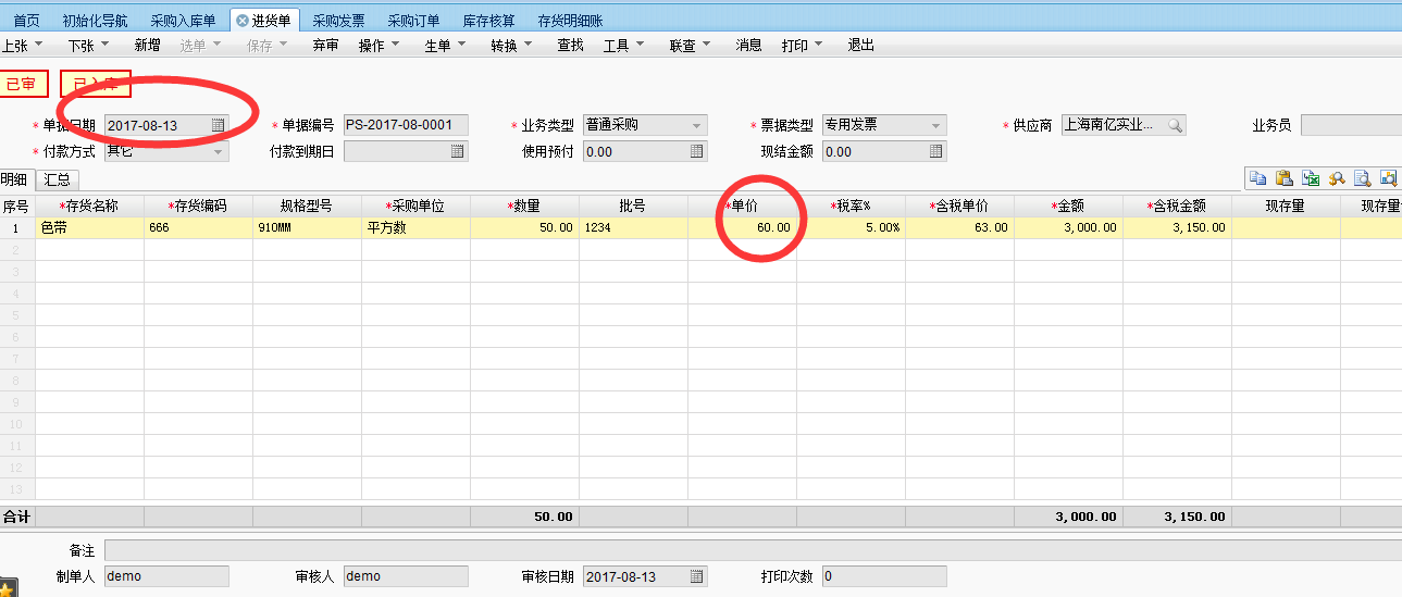 (2)8月13日收到发票填完采购发票/进货单审核以后,入库单上的单价不会被反填,仍然是暂估单价,但是入库单上会有“已核算”的标志。