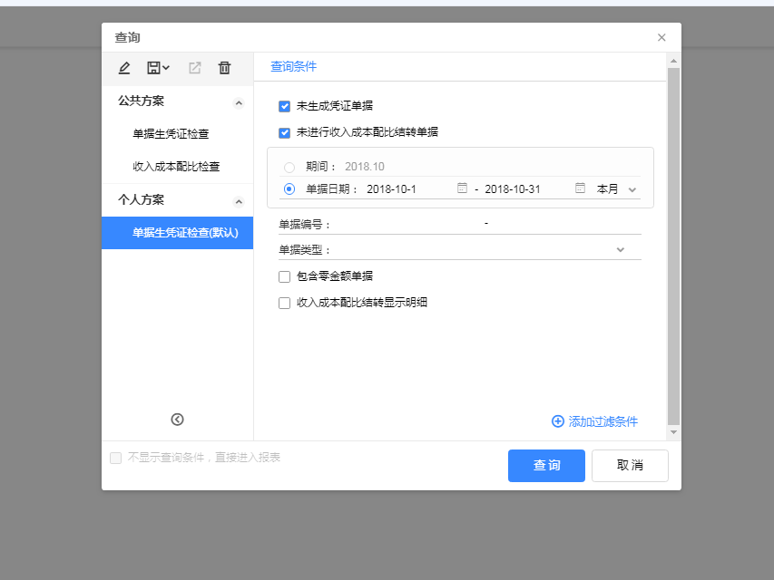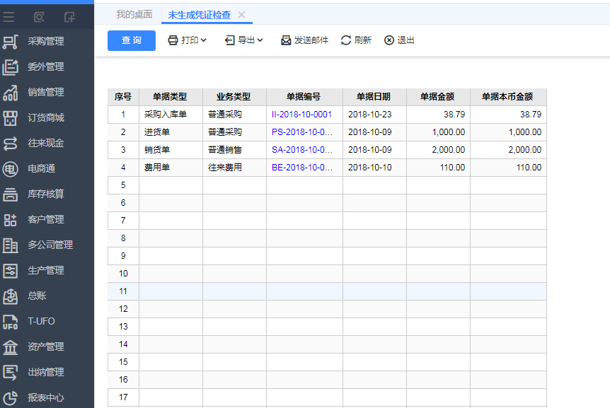 该功能可以及时快速的查询过往时间内,那些单据没有生成凭证,从而快速的帮助账务人员补充做账
