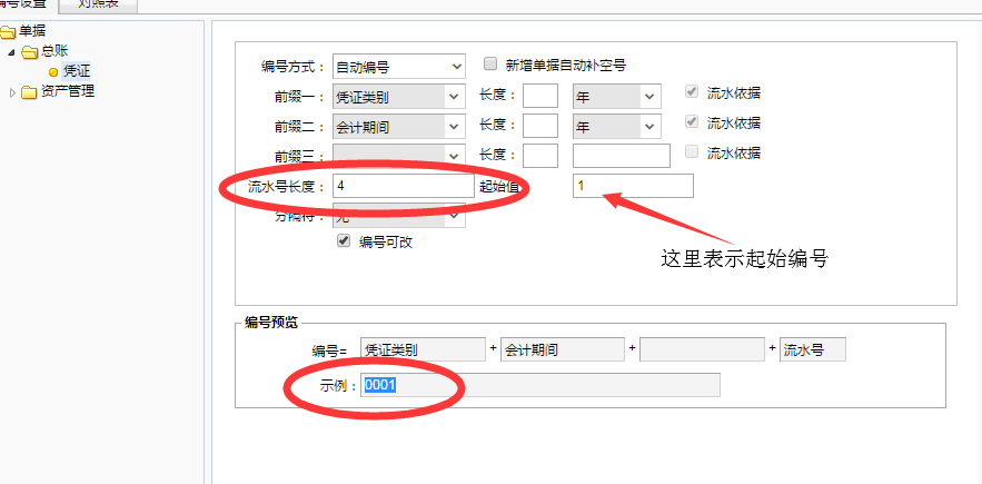 修改流水号长度就可以修改凭证编码的长度了,下面还有实例显示