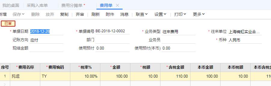 畅捷通T+采购入库单生成费用单后,做费用分摊选择不到费用单,
