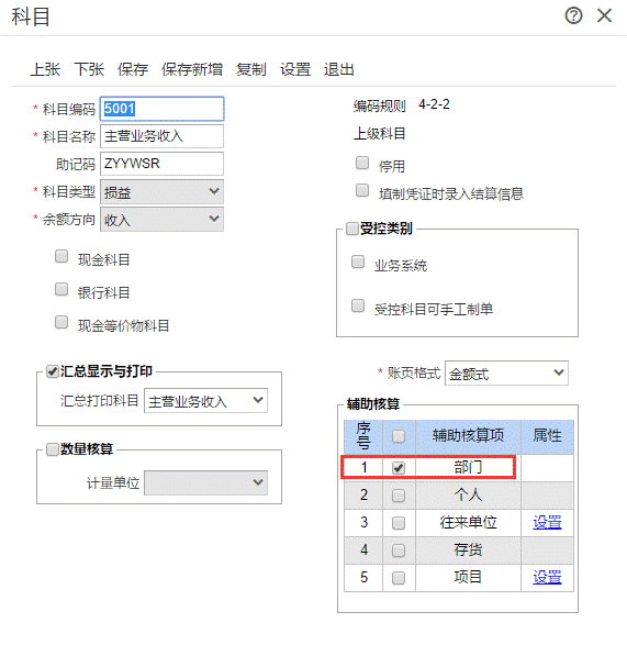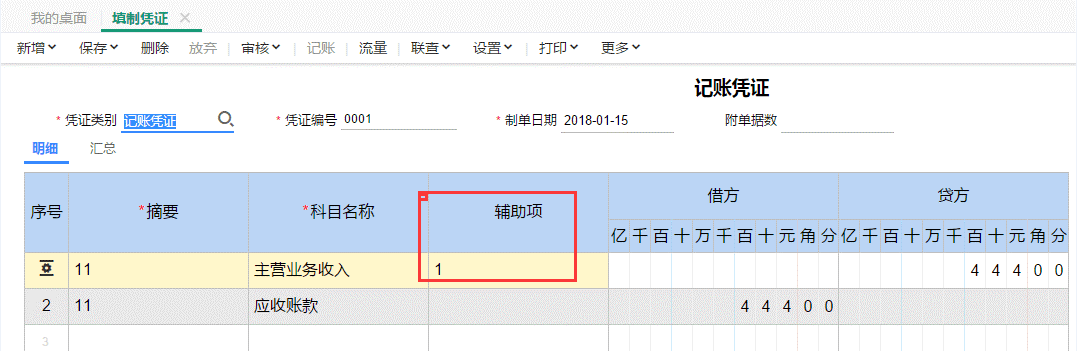 第二步、填制凭证,主营业务收入(5001) 分别录入部门1和部门2: