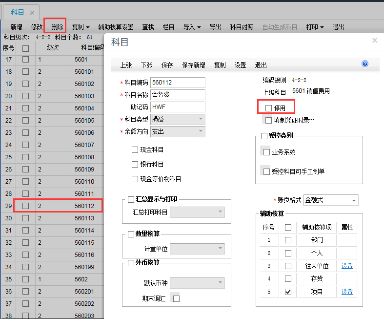 处理方法:使用过的科目不允许删除,只能停用;如果没有使用过的科目在基础设置-科目中用选择该科目点击表头删除即可。