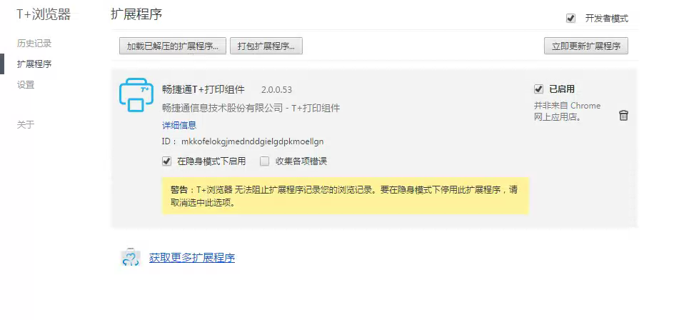 解决方法:打开T+浏览器,点击右上角菜单,点设置,点扩展设置,畅捷通T+打印组件设置,将“启用并非来自Chrome网上应用店”打勾,再将“在隐身模式下启用”打勾,退出,再重新登陆T+账套,打开T-UFO资产负债表,显示正常,完成。