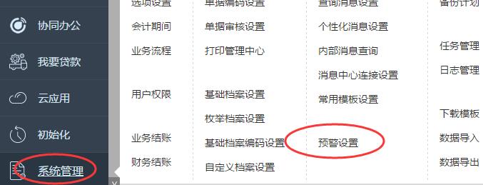 这个预警功能可以在系统管理——预警设置里面设置,在这里不仅可以设置备份预警,还可以设置存货的安全库存预警,销售备货预警,采购进货预警提醒等。