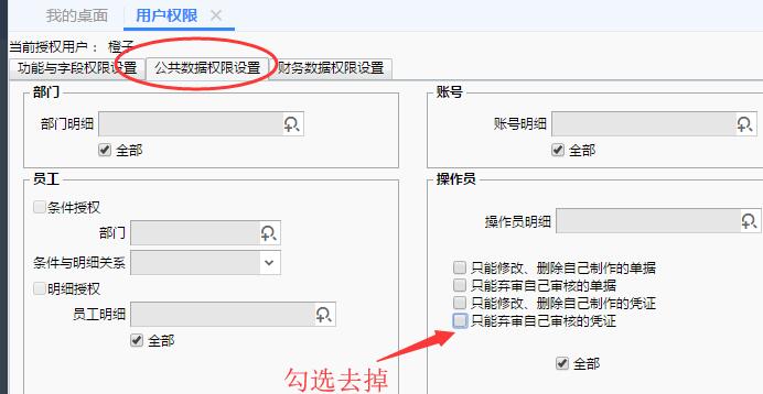 依次点击【系统管理】-【用户权限】-选中需要进行弃审操作的用户,可以是具体的【独立用户】或者组下面的具体用户-点击【用户授权】-【公共数据权限设置】页签-【操作员】中,根据取消或勾选【只能弃审自己审核的凭证】,如果勾选,则表示当前用户只能弃审自己审核的凭证,如果不勾选,则表示当前用户可以弃审别人审核的凭证。
