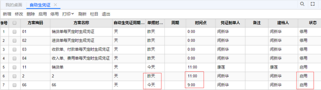 可以自由定义自动生凭证的单据,时间节点和周期;随时修改方案的启用状态。