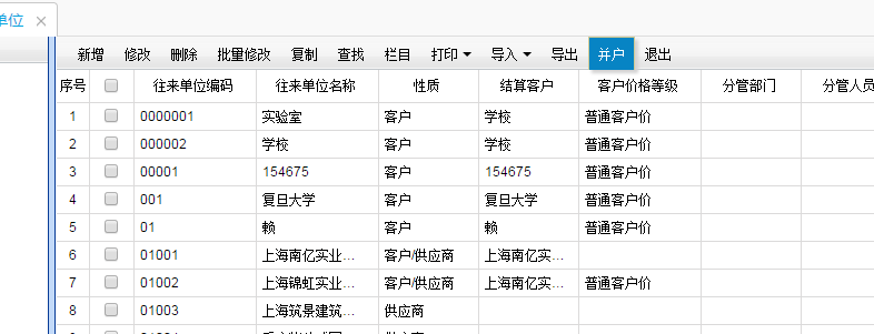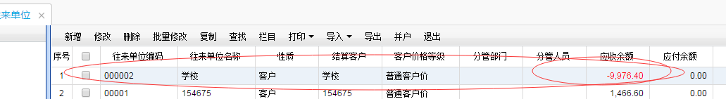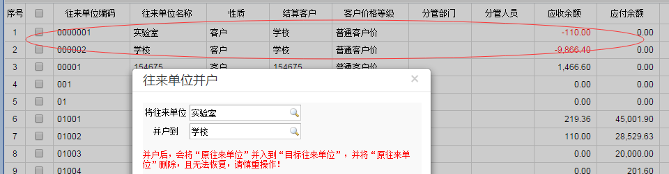 点击【往来单位】——点击表头工具栏【并户】——选中您所需要合并的单位确定后,如下图,此往来款等,会直接合并相加取总数