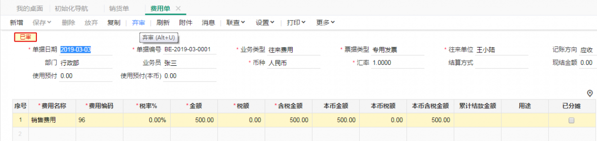 第二部:在销售管理,新增一张销货单保存后。 再次销货单界面点击“工具”—“费用单”,新增填制金额为500的费用单,并保存、审核此费用单。