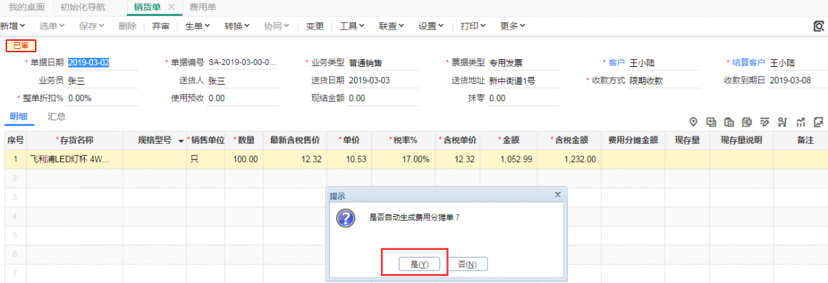 然后再审核销货单,会弹出自动分摊费用单,然后点击是,系统自动分摊。