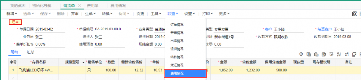 在销货单界面,点击联查费用情况,可以查看到费用单。