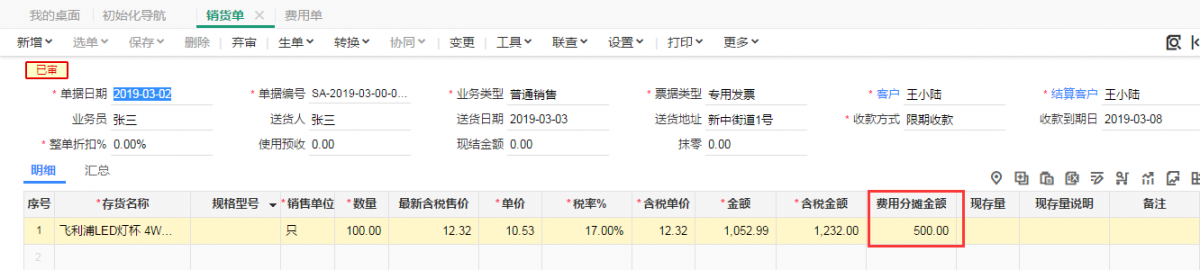 第三部:销售费用自动分摊之后,在销货单表体销售明细中会自动显示本次费用分摊金额500元,费用分摊金额为费用单上的不含税金额。