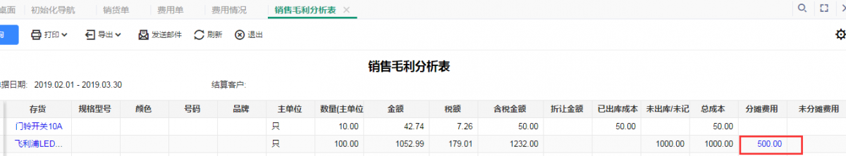 第四步:分摊完成之后,查看销售毛利分析表,毛利中会把这个费用自动减掉。点击“销售管理”—“综合报表”—“销售毛利分析表”,已分摊的费用在这张表中能够体现出来,其中,毛利=立帐单据金额-总成本-总费用-折让金额。这样我们的毛利也自动计算了,而且数据更加精准。