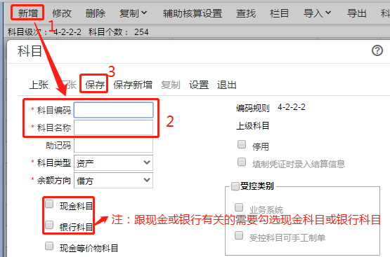 注:【新增】界面右上角的【编码规则】,假设【编码规则】是4-2-2,那么新增的二级科目的编码应该是100201,二级科目下增加的三级科目编码就是10020101