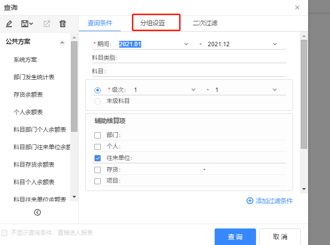 二、把分组设置里面的往来单位小计勾选取消,即可