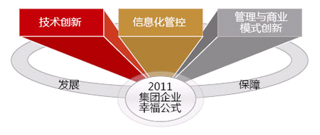 在此背景下,用友公司在中国6000家集团企业更佳实践基础上,睿智地提出了“技术创新+管理与商业模式创新+集团企业信息化管控=2011集团企业”的“2011幸福公式”。用友软件管控解决方案包括集团内控和风险管理、预算管理、集团财务与报表管理、集团资产管理、信息化平台管理、全面业绩管理、集团人力资源管理等方面,这些方案都有助于帮助集团企业构建高效的管控体系。