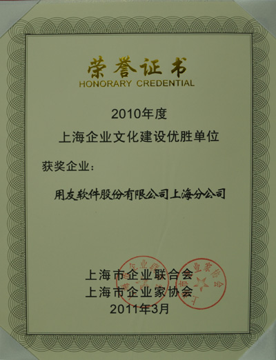 用友软件上海分公司在4月1日隆重召开的“上海企业文化成果发布会”颁奖仪式上,在众多上海市著名企业中脱颖而出,被授予“2010年度企业文化建设优胜单位”殊荣。2010年伊始,上海用友在李宏伟总经理带领下,在公司内部开展以“阿拉一家亲”为主题的一系列文化建设举措,此次获奖给一年来的企业文化建设工作给予了充分肯定。2010企业文化建设优秀成果申报、征选、评审活动,在上海市委宣传部指导下,由上海市企业文化促进会,上海市企业联合会、上海市企业家协会联合主办。