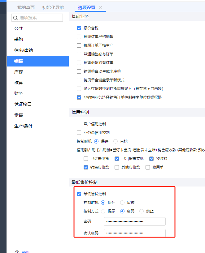 2、系统管理-选项设置 销售页签勾选最低售价控制,设置控制时机和控制方式