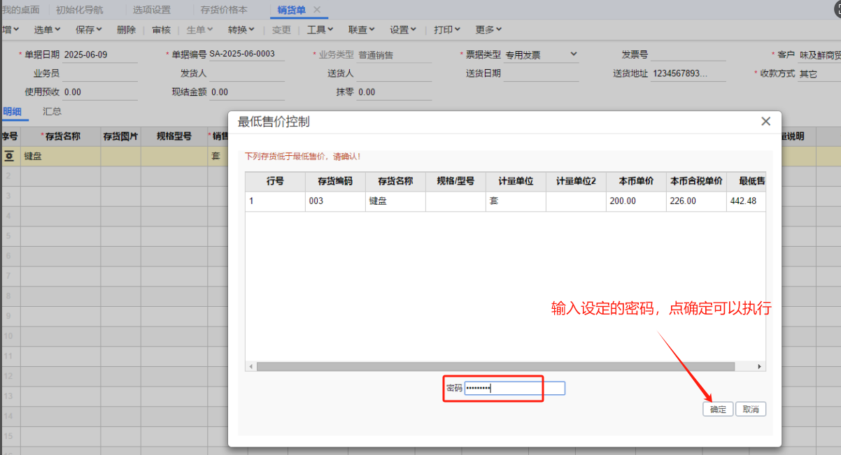 1、基础设置-客户价格本,设置最低售价公式取值为存货最新进价