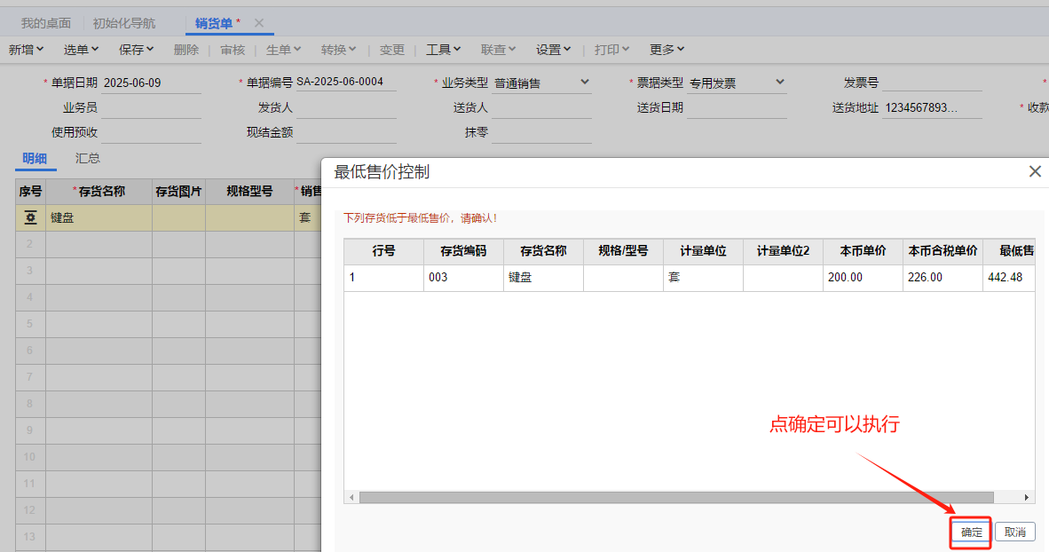 3、填制销售单据时,当售价高于了最低售价(存货最新进价)时系统会自动弹出提示