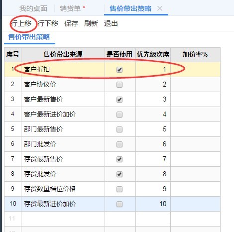设置好了点保存,但是这样还是不能再单据上马上体现折扣信息,原因在与,您的售价带出策略必须首选是客户折扣,