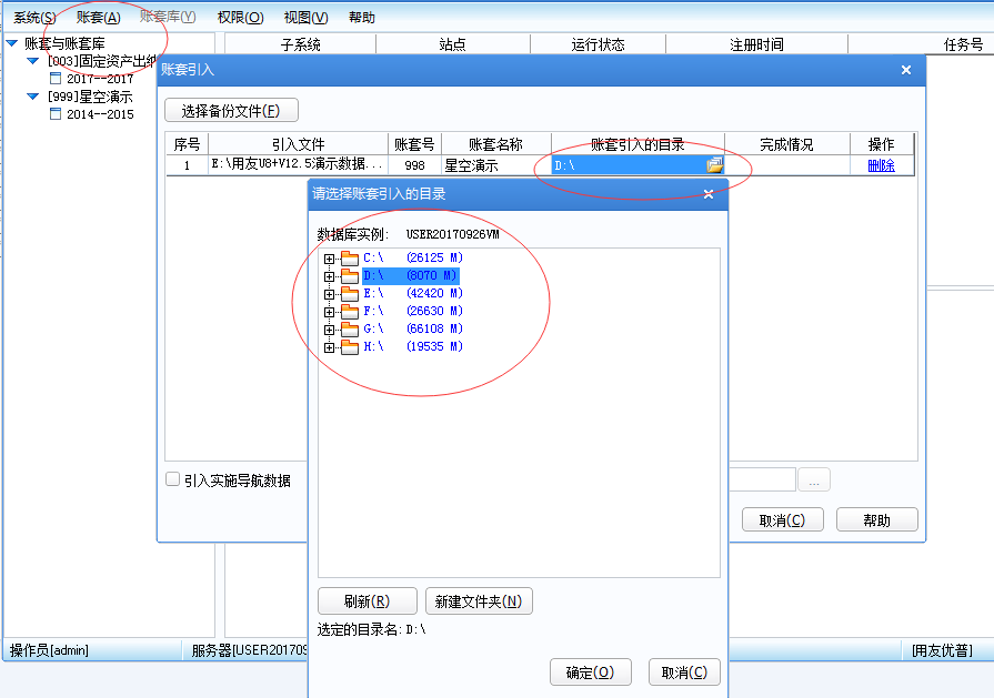 打开系统管理用admin用户登录 点击 账套 点击引入 如下图