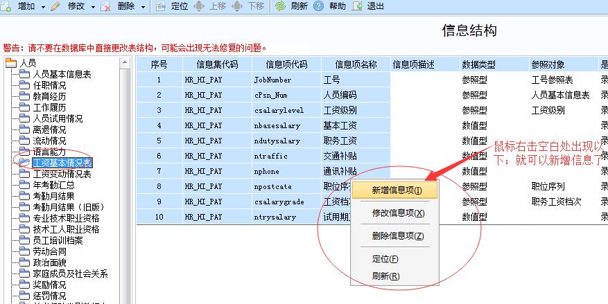 通过 人力资源——HR基础设置——信息结构——工资基本情况表里面添加