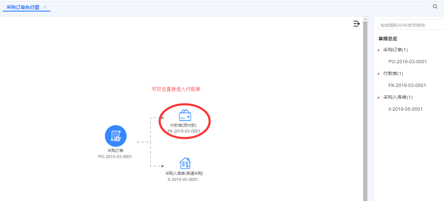 进入【订单执行图】中.不仅可以看见执行情况.还可以双击关联的单据直接打开该单据进行操作。
