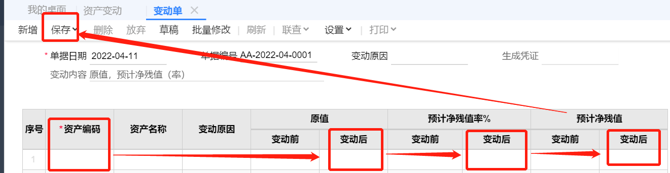 3、选择需要变动的资产,维护变动后原值,还可以修改预计净残值率,填好单据内容后,点击保存即可实现资产原值变动。