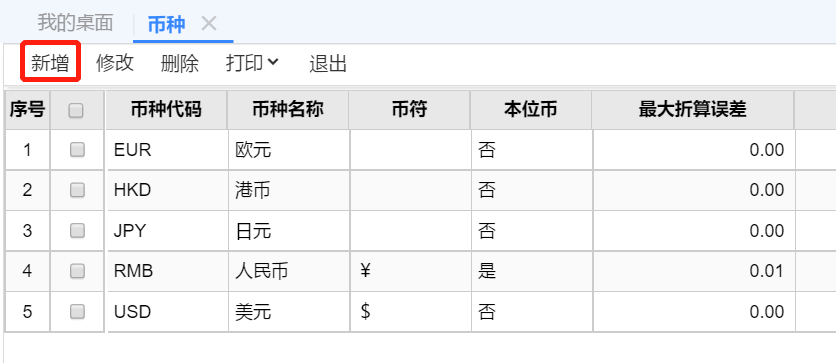二、再币种列表界面,点击左上角【新增】按钮,增加企业所需的外币币种。