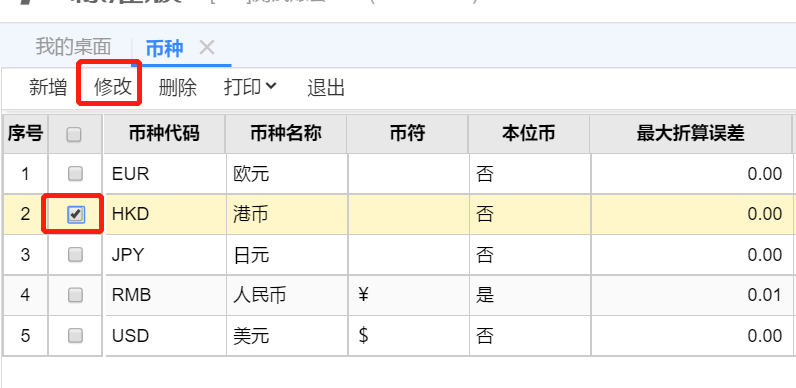 五、若币种信息有误需要修改,勾选外币,点击菜单栏上【修改】按钮,修改完毕后重新保存即可。