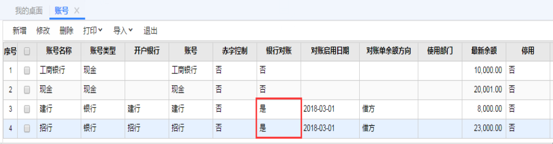 二、进入账号界面,将相应账号的【银行对账】选择【是】