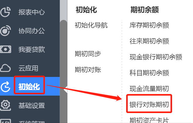 三、点击【初始化】--【银行对账期初】,进入银行对账期初界面。