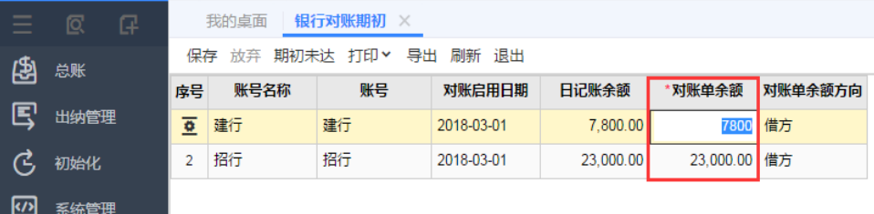 四、日记账余额和对账单金额取的现金银行期初里的数据。如果需要修改日记账余额,需要先再【初始化】--【现金银行期初】中修改,然后在【银行对账期初】界面点击【刷新】即可。