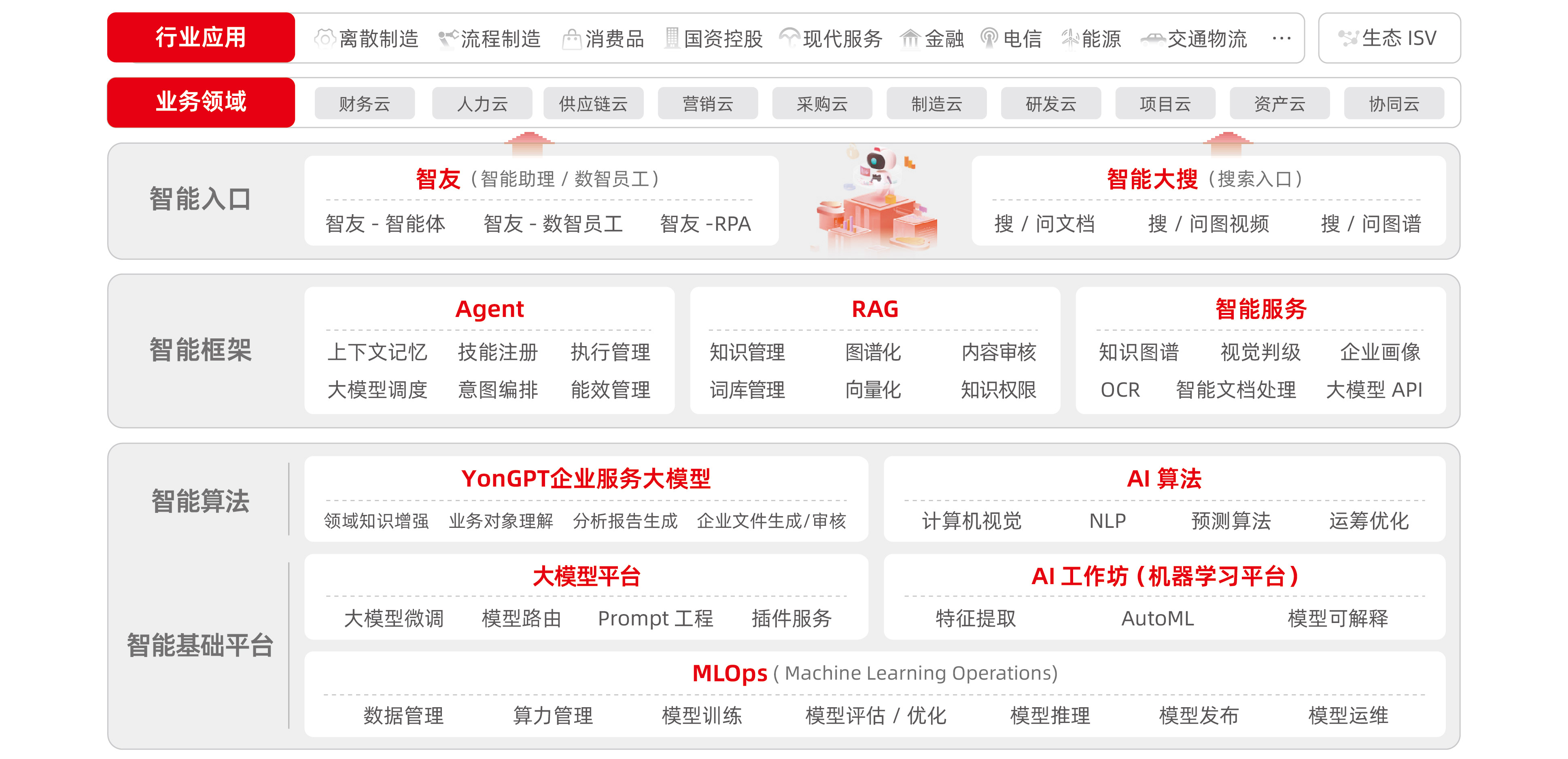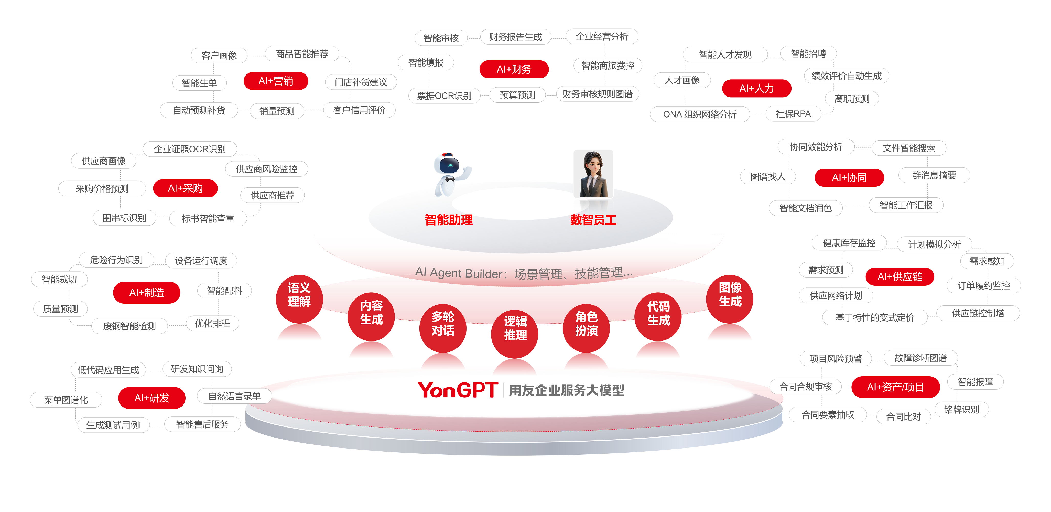 YonAl智能平台以 YonGPT企业服务大模型为核心,整合了机器学习、大模型、数字人、自动化等企业级智能技术,构建全面的智能化平台能力,打造企业数智化大脑,帮助企业实现智能化管理 和运营,提高效率和竞争力。