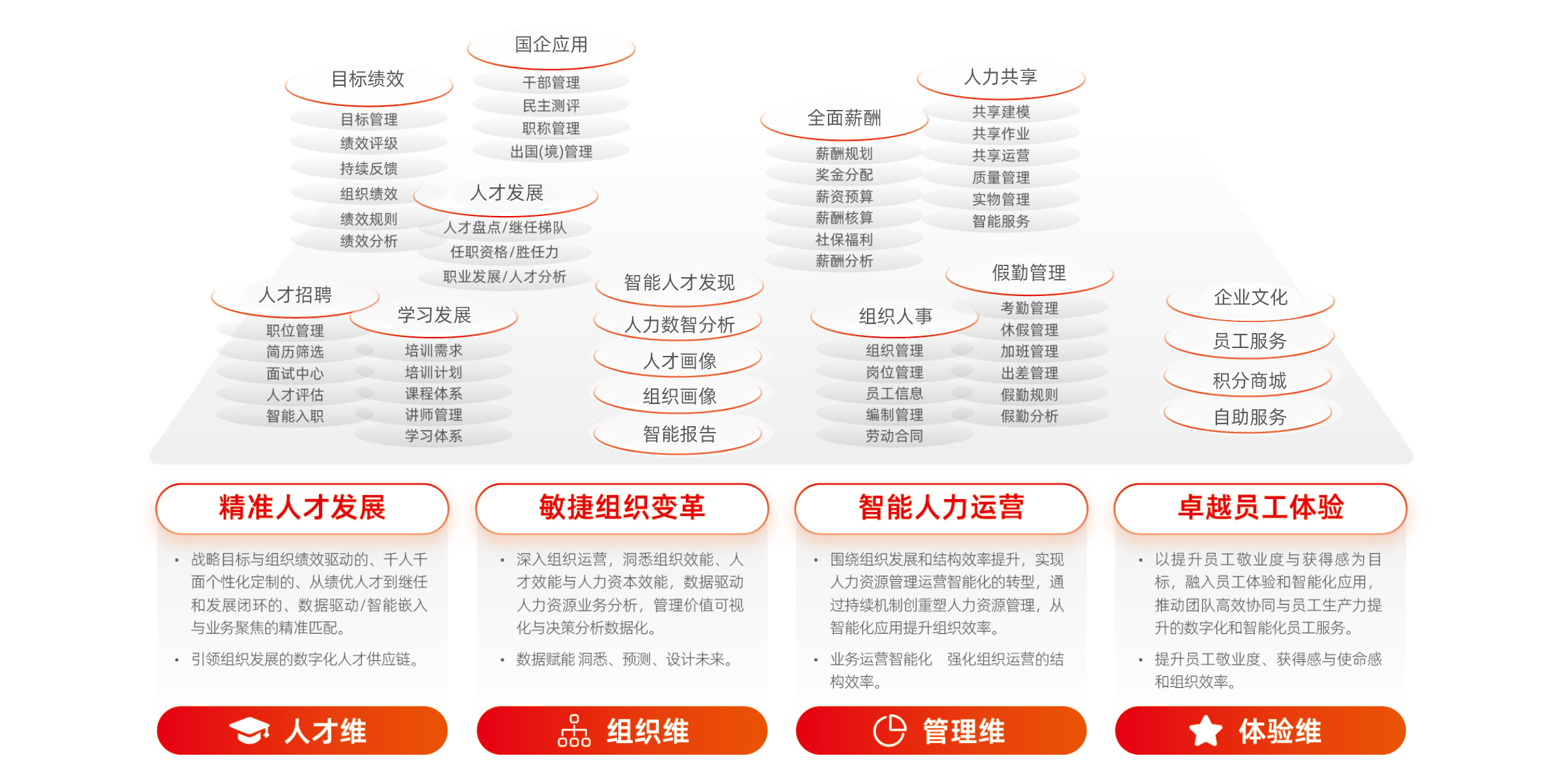 用友人力云融合人工智能技术,以“赋能员工 激活组织”为宗旨,以提升企业组织能力为目标,基于“精准人才发展 敏捷组织变革 智能人力运营 卓越员工体验”关键价值,帮助企业实现人力资源管理效率提升、应用体验改进和智能决策分析,推动人力资源管理范式升级。